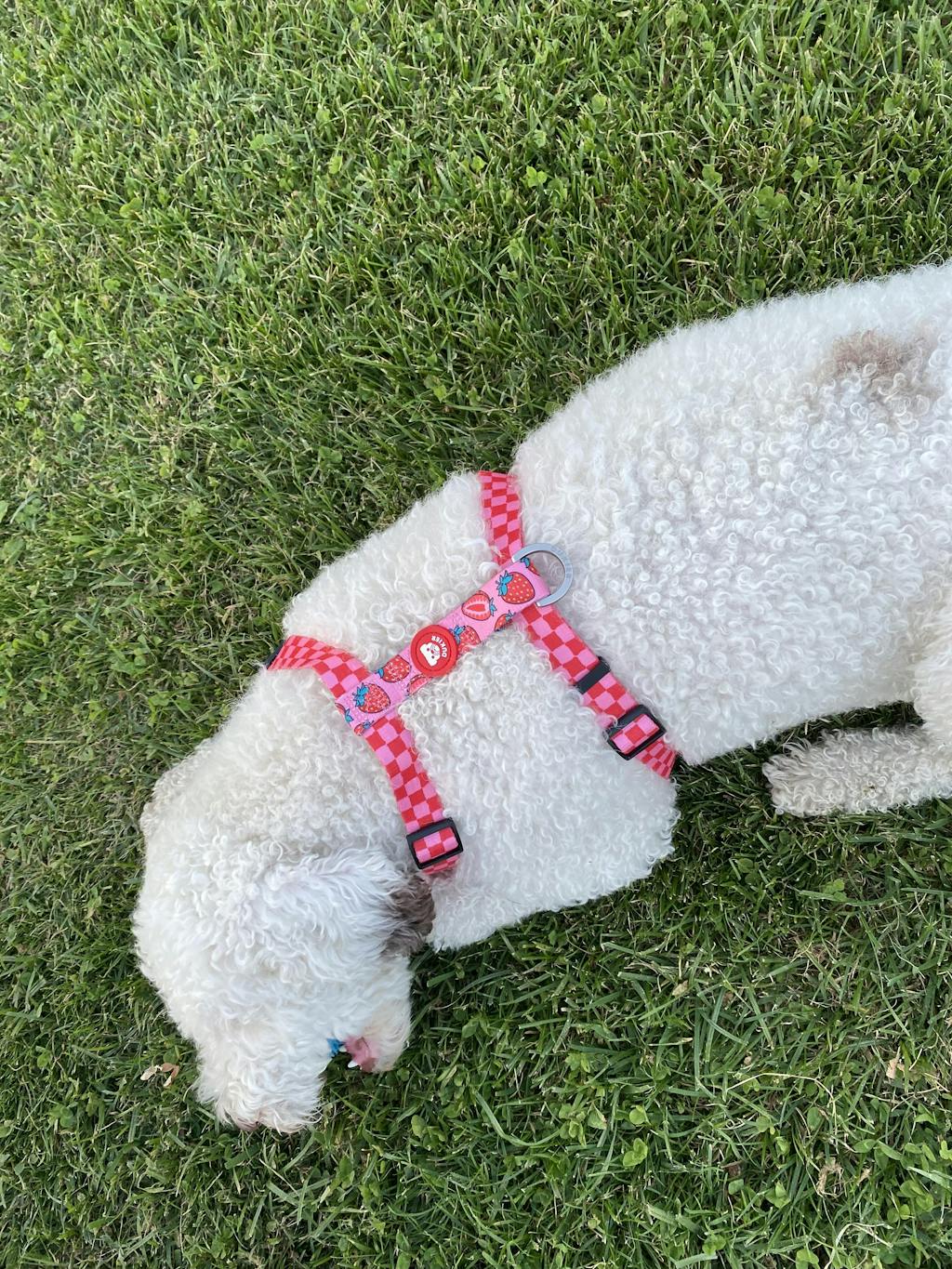 Buscaba un arnés clásico para mí peque y este es precioso me encanta el estampado de fresa