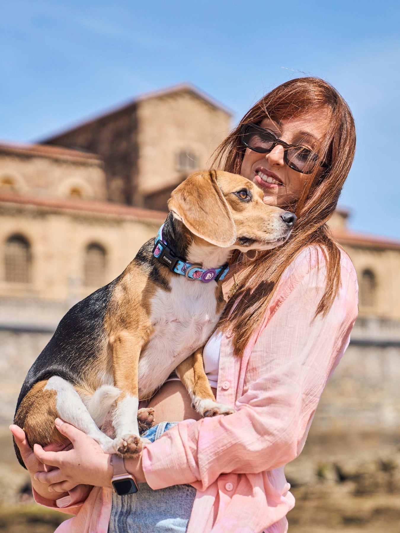 Usamos el collar para que lleve la chapita y además Reina va conjuntada con el arnés, la correa y el porta bolsitas.