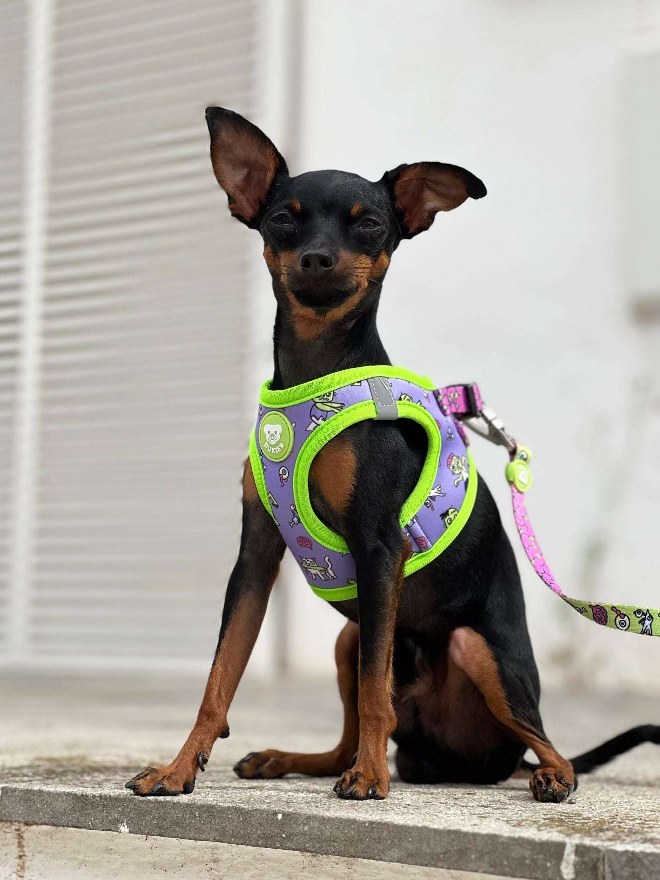 The Dukier body harness keeps your dog super comfy and secure. It’s very easy to put on, even for the wiggliest pups: step in with the paws, then close on the back—no need to go over the head. The fabric is breathable mesh on both sides so your dog stays cool and comfy throughout the walk, with a double closure.