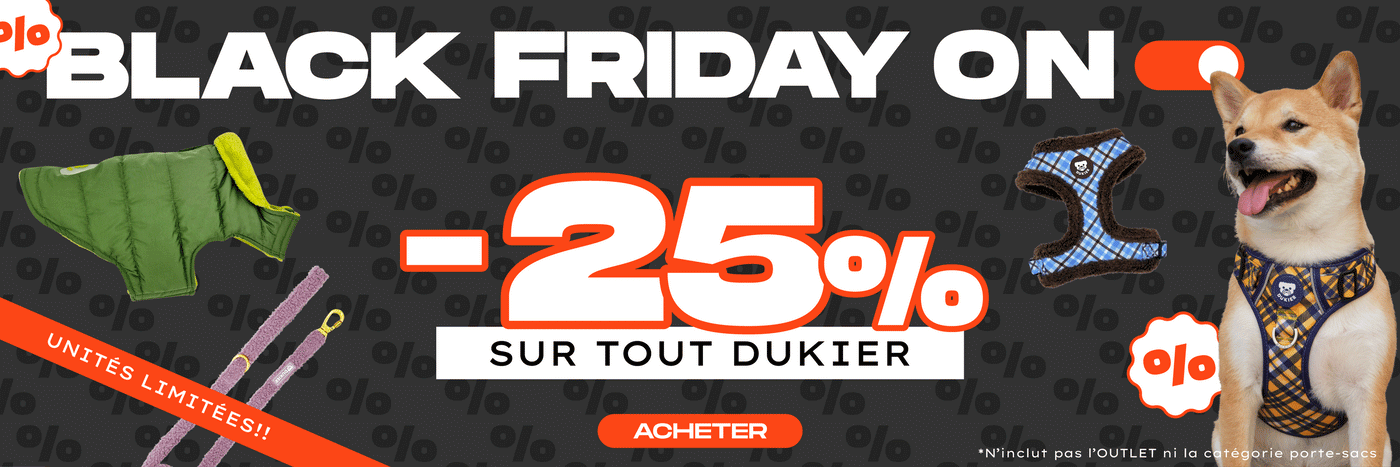 Le Black Friday est là ! Chez Dukier, nous avons préparé les meilleures réductions de l’année sur des accessoires uniques et originaux pour votre chien. Profitez de cette occasion pour gâter votre compagnon avec des colliers, harnais et bien plus encore. Tout ce dont vous avez besoin pour qu’il soit le plus stylé du parc est en promotion !