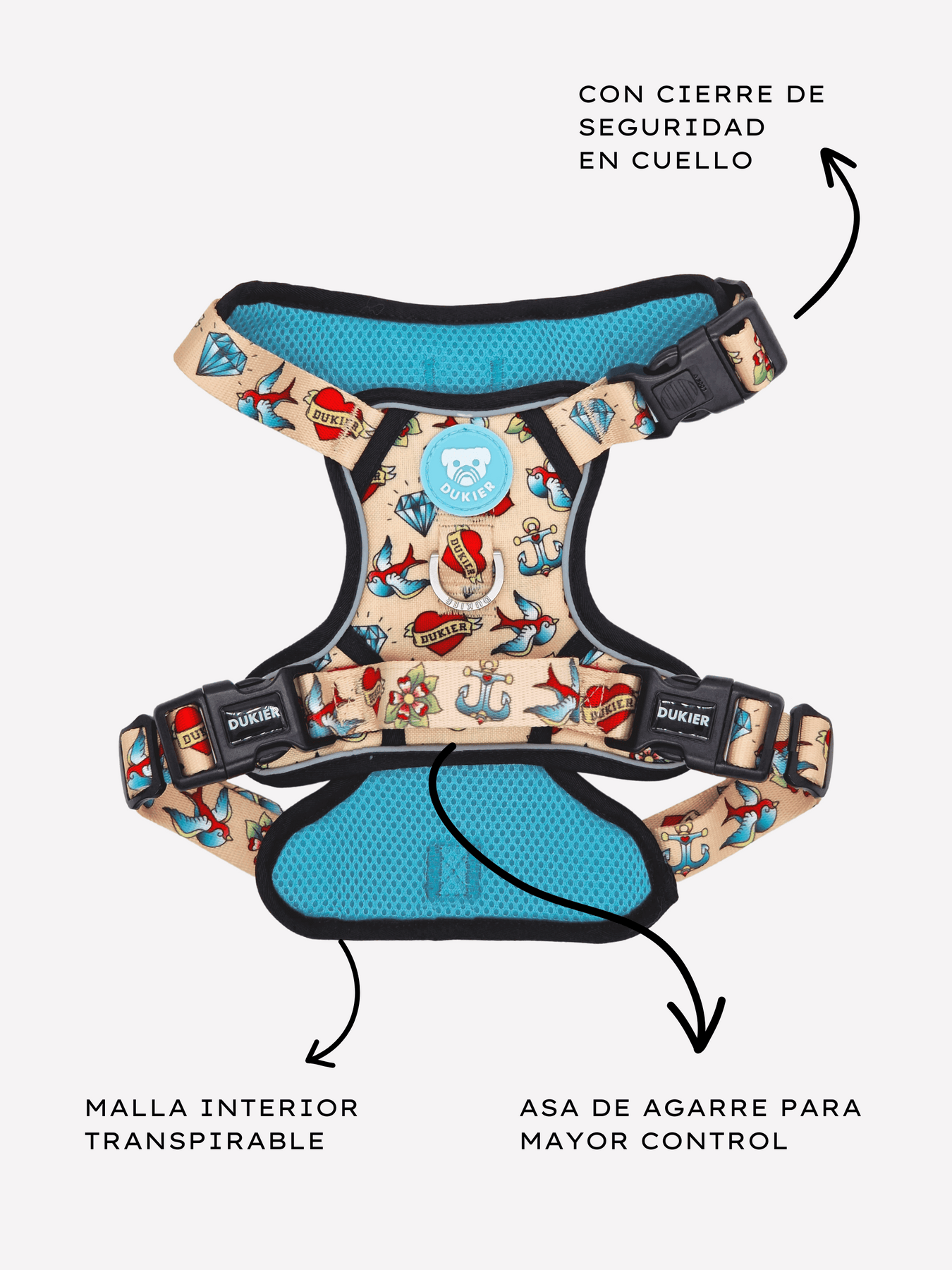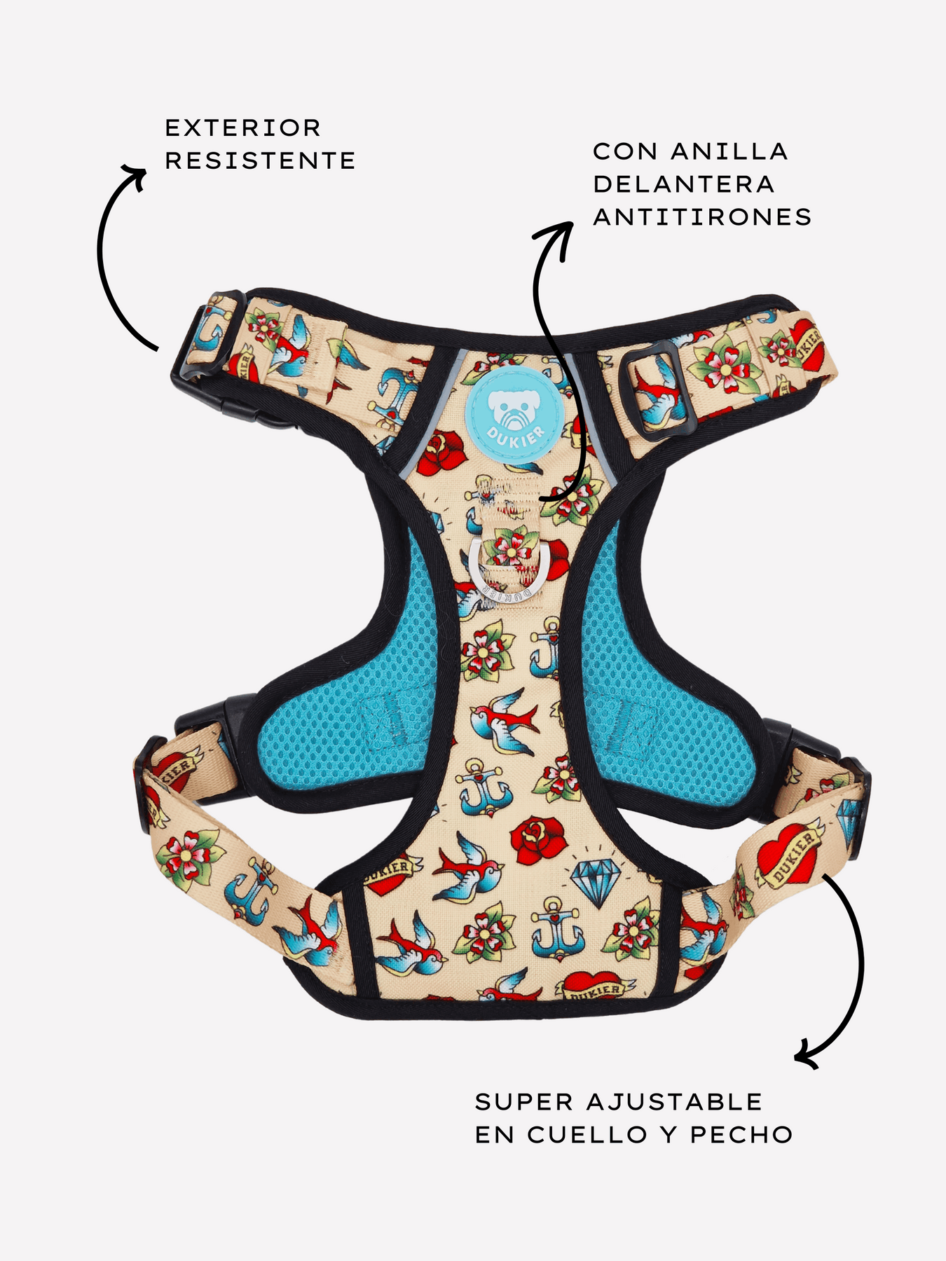 - Anilla extra en D en pecho para anclar correa y evitar cualquier tirón.